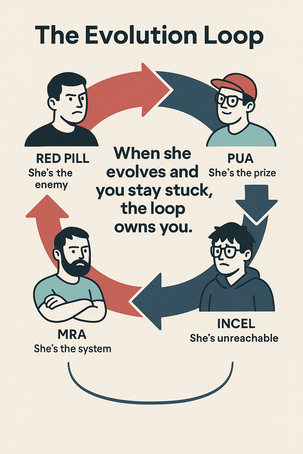 A collection of online communities ranging from Red Pill adherents, Pick-Up Artists (PUAs), Involuntary Celibates (Incels), and Men’s Rights Activists (MRAs), this space has become a lightning rod for discussions on gender, relationships, and the shifting dynamics of masculinity in modern society, as women are consistently promoted as evolving. Men are seen as staying the same. A vicious wheel of propaganda that doesn’t seem to stop.